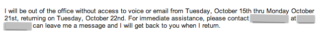 Standard: “Should you have specific needs that cannot wait for my return, please email assistant@companyname .com or call 617-555-1000 and my staff can help you.”