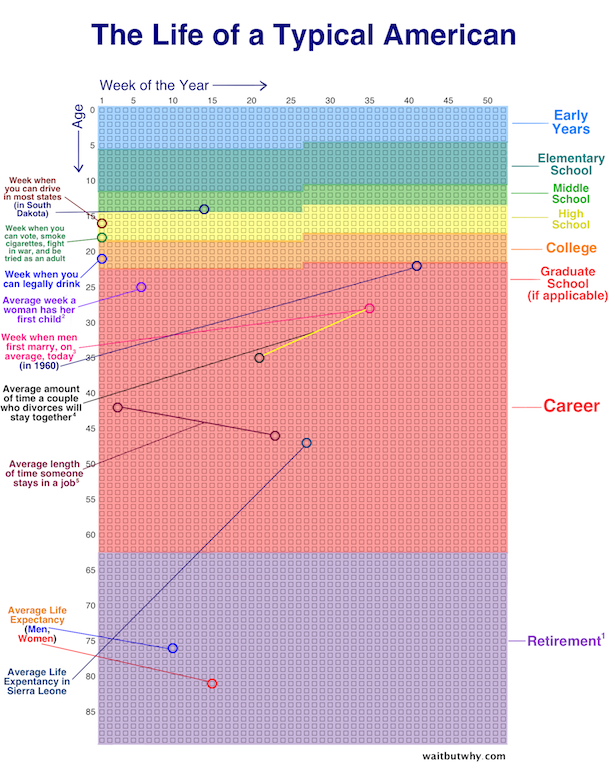 Below is a particularly powerful graphic that displays the life of a typical American in the form of small week blocks. I’ve also shared some ideas for how to leverage it in your discussions with clients.
